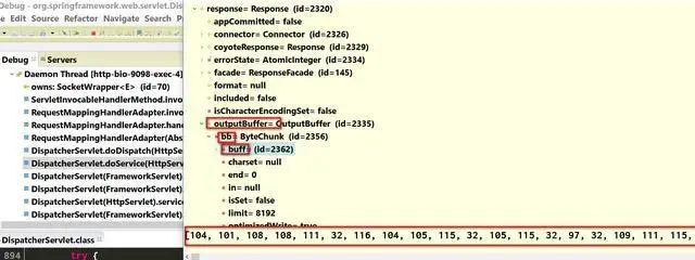 我们看下DispatcherServlet.doService里的HttpServletResponse里是否包含了我们期望的输出字符串。在调试器里展开response变量: