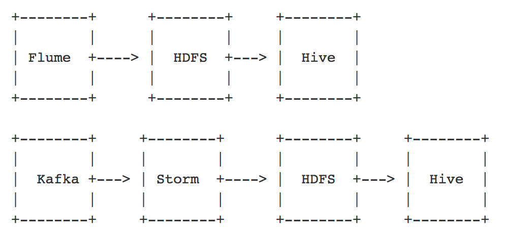 如图 2 所示,实时流 ETL 通常有两种形式:一种是通过 Flume 采集服务端日志,再通过 HDFS 直接落地;另一种是先把数据采集到 Kafka,再通过 Storm 或 Spark streaming 落地 HDFS,实时流 ETL 在出现故障的时候很难进行回放恢复。美图目前仅使用实时流 ETL 进行数据注入和清洗的工作。