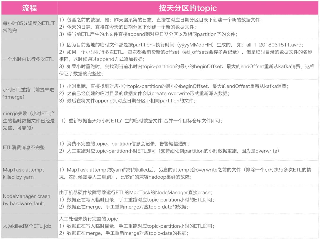 根据 Lambda 结构,如果实时流 ETL 出现故障需要离线 ETL 进行修补。离线 ETL 是从 Kafka拉取消息,经过 ETL 再从 HDFS 落地。为了提高实时性及减轻数据压力,离线 ETL 是每小时 05 分调度,清洗上一个小时的数据。为了减轻 HDFS NameNode 的压力、减少小文件,日期分区下同个 topic&partition 的数据是 append 追加到同一个日志文件。