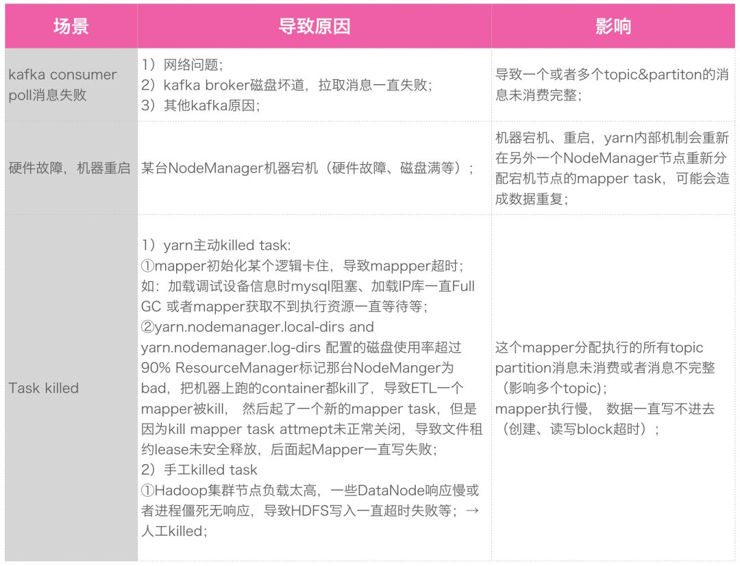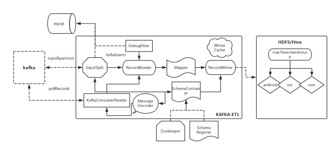 Output (OutputFormat) :创建 RecordWriter 将处理过的 key-value 数据按照库、表、分区落地;最后在 commit 阶段检测消息处理的完整性。