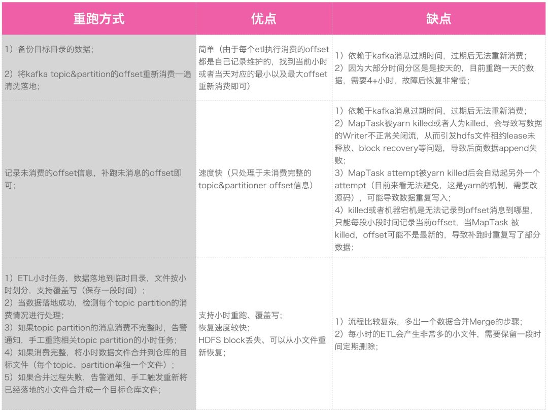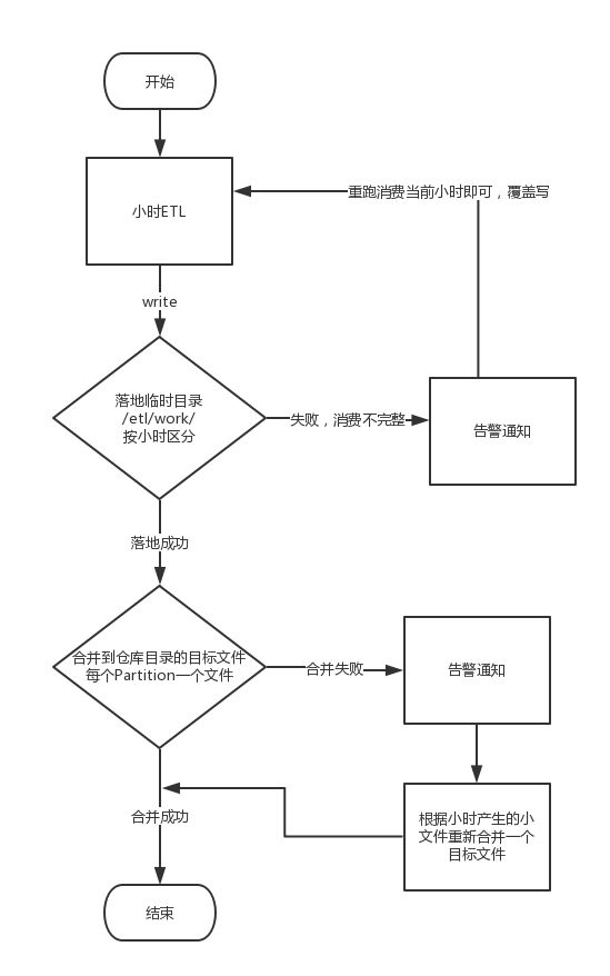 如图 9 所示是第三种重跑方式的整体流程,ETL 是按照小时调度的,首先将数据按小时写到临时目录中,如果消费失败会告警通知并重跑消费当前小时。如果落地成功则合并到仓库目录的目标文件,合并失败同样会告警通知并人工重跑,将小文件合并成目标文件。