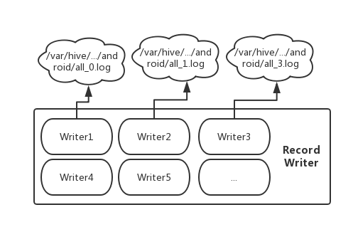 如图 7 所示,每个 RecordWriter 包含多个 Writer ,每个 Writer 对应一个文件,这样可以避免同一个文件多线程读写。 目前是通过 guava cache 维护 writer 的数量,如果 writer 太多或者太长时间没有写访问就会触发 close 动作,待下批有对应目录的 kafka 消息在创建 writer 进行 append 操作。这样我们可以做到在同一个 map 内对多个文件进行写入追加。