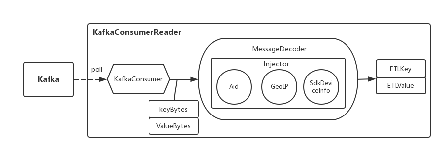 MessageDecoder 接收到 Kafka 的 key 和 value 时会对它们进行反序列化,最后生成 ETLKey 和 ETLValue。同时 MessageDecoder 内包含了 Injector,它主要做了如下事情: