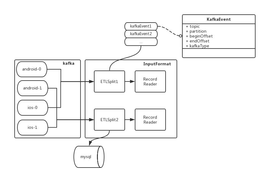 4.kafka-etl 将本次需要处理的 topic&partition 的 offset 信息抽象成 kafkaEvent,然后将这些 kafkaEvent 按照一定策略分片,即每个 mapper 处理一部分 kafkaEvent;