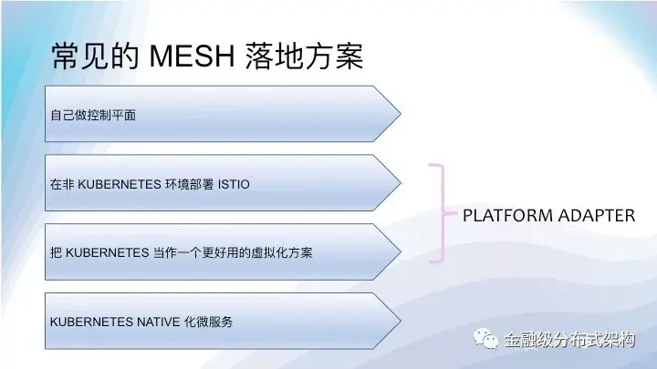 后来又了第三种做法,据说也有不少公司采用,具体做法是把 Kubernetes 做一个虚拟机用,阉割其服务发现,DNS 等能力,用注册中心/配置中心等成熟且大规模应用的产品替代。唯品会前几天发的文章说明他们已经把这个做法在生产中落地了。这种做法一般只使用 POD 和 StatfuleSet,不创建服务和Endpoints。一般来说, ISTIO 通过 Platform Adapter 对接注册中心,Config Adapter对应配置中心。相比前两种做法,这个做法更加复杂,好处是成熟的配置中心和注册中心能够快速的落地 ISTIO,不用解决 ISTIO 由于 ETCD 存贮带来的扩展性问题。这个做法还有个变种就是完全不用 ISTIO,直接在 ENVOY/MOSN 上对接注册中心和配置中心,甚至完成 MIXER 的检查和遥测上报的能力。比如唯品会,用的是 DaemonSet,在同一个 Node 上共享 SIDECAR,其 SIDERCAR 组件 OSP Local Proxy 直接集成注册中心/配置中心。
