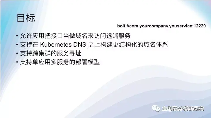 我们会在 Kubernetes 的 DNS 之外额外做一层域名抽象,不受 Kubernetes 的规则的限制,比如,允许用户直接使用 interface 作为域名或者按照组织结构来规划域名的层级关系。Kubernetes 的 namespace 往往被用来作为多租户的解决方案,并不适合用来作为企业内不同部门的逻辑划分。