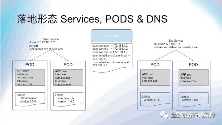 服务将会被按照接口维度创建,接口的版本和名字会反应在 POD 的 Label 上,这样做会增加运维的工作量,但是可以通过 PasS 平台提供的工具解决这个痛点。这里面一个隐含的要求是,一个 POD 只会提供一个接口的服务,推动业务走向 Kubernetes Native。