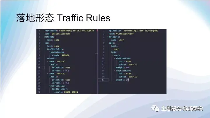 我们希望能够用 Interface 来调用服务,就是为了适应 RPC 框架的这个基于接口名字识别服务的概念模型。体现在 Kubernetes 里面就是用 Interface 名字当做域名,把请求头映射到 HTTP 头,请求参数映射到 Query Parameter,方法名映射到 Path 上。这样,基于 RPC 请求内容的服务治理就可以定义到方法和参数级别了,即便是蚂蚁金服站内复杂路由规则,比如 LDC 单元化流量调拨,也是可以支持的。