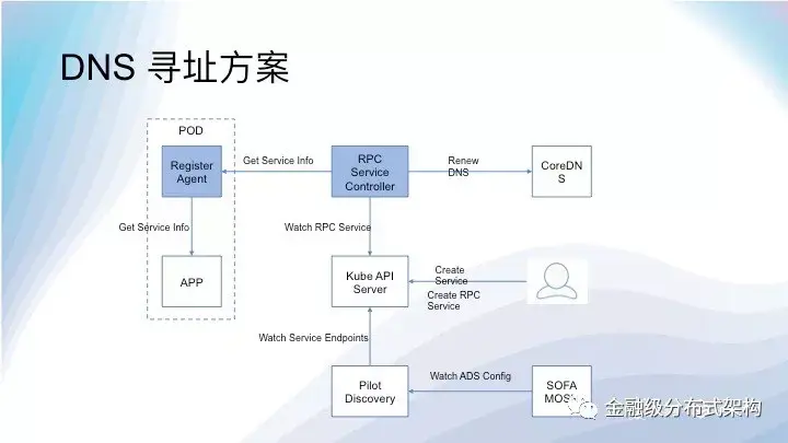 RPC Service Controller 监听到 RPC Service 更新后,通过关联的 Service,按策略找到其中一个 POD,向其发起服务列表查询。请求到达 Register Agent,Agent 通过其协议插件从 APP 实例中获取到服务列表信息后返回给 RPC Service Controller。RPC Service Conroller 使用 RPC Service 接口和 Cluster VIP 更新 CoreDNS 中的域名记录。