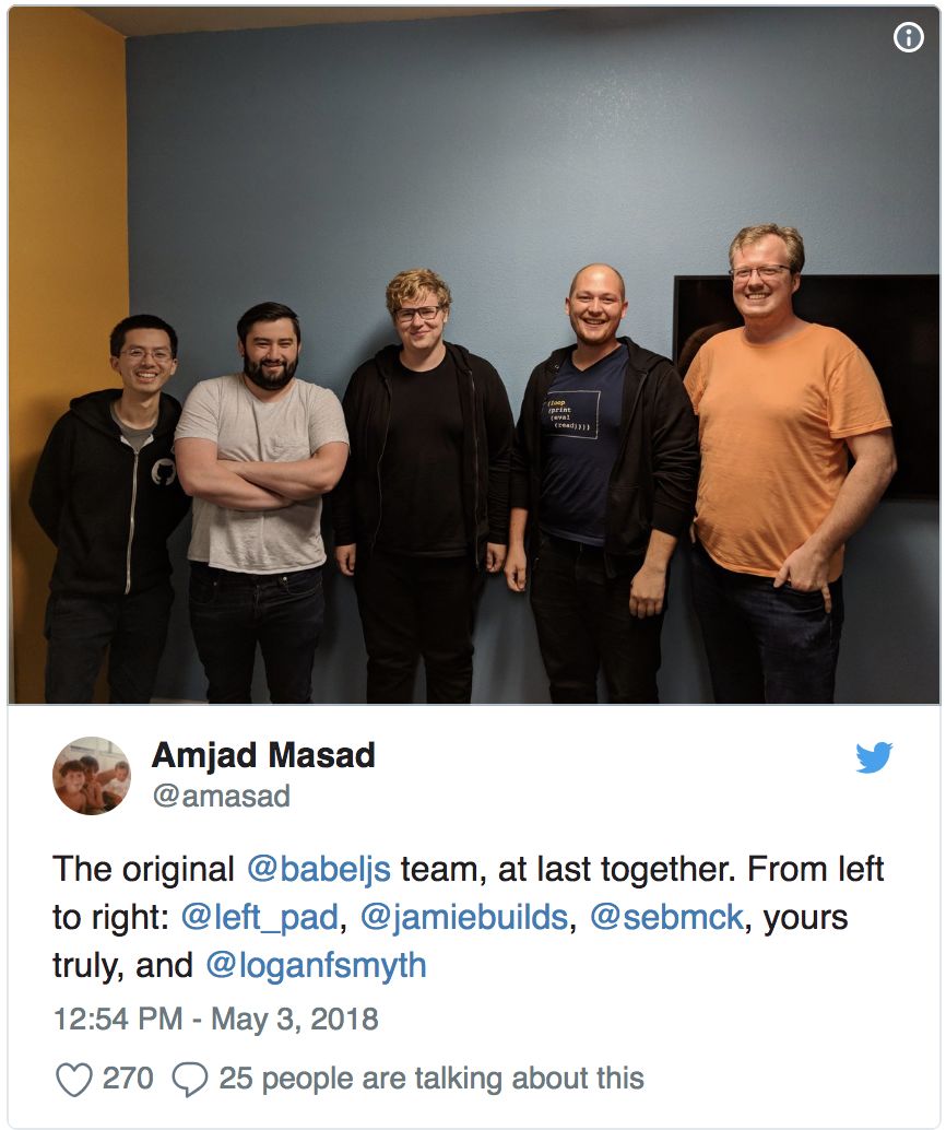 Babel 由志愿者驱动虽然 Babel 对 JavaScript 语言的未来,甚至对社区和 js 生态都产生了巨大的影响,但你肯定想不到,他们的维护者只是由社区的几个志愿者组成。