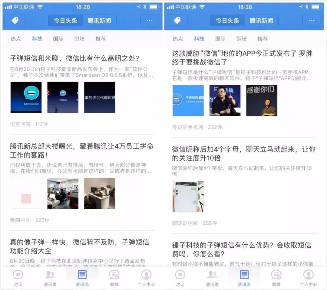 子弹短信的底部菜单栏没有微信上常见的朋友圈,却以资讯流频道进行替代,这种变化也让人摸不到头脑,难道罗永浩认为社交动态分享是应该取缔的功能?