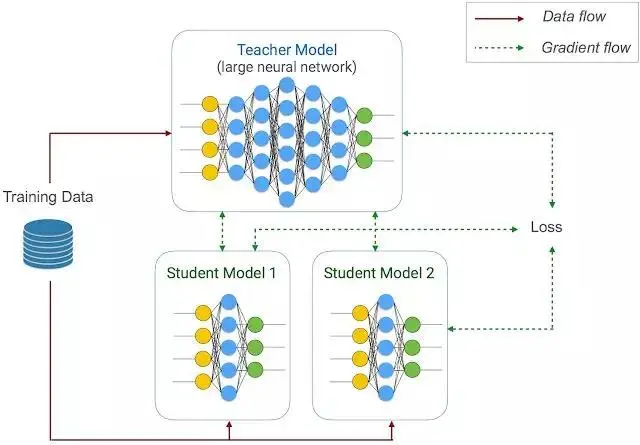 通过删除对预测最不重要的权重或操作(例如低评分权重)来缩小模型的大小。这对于涉及稀疏输入或输出的设备模型非常有效,尺寸可以缩小 2 倍,同时保留 97% 的原始预测质量。 量化技术在训练重的应用特别有效,并且可以通过减少用于模型权重和激活的比特数来提高推理速度。例如,使用 8 位定点代替浮点数可以加速模型推理,降低功耗,并进一步将尺寸减小 4 倍。 遵循师生学习策略使用联合培训和精馏方法- 我们使用一个更大的教师网络(在本例中,用户提供的 TensorFlow 模型)来训练一个紧凑型的学生网络(设备上的模型),其准确性损失最小。