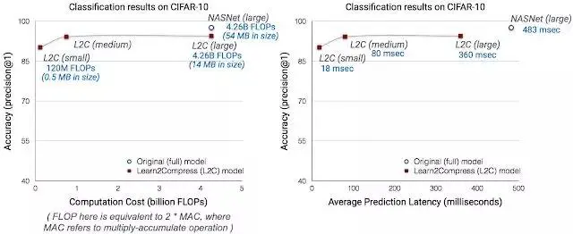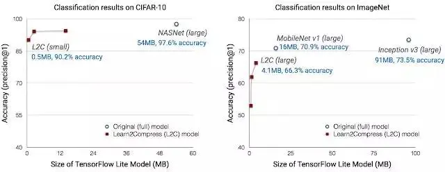 对于图像分类,Learn2Compress 可以生成适合于移动应用的具有良好预测精度的小型快速模型。 例如,在 ImageNet 任务中,Learn2Compress 实现的模型比 Inception v3 Baseline 小22倍,比 MobileNet v1 Baseline 小 4 倍,精确度仅下降 4.6-7%。 在 CIFAR-10 上,联合训练具有共享参数的多个 Learn2Compress 模型,比单个 Learn2Compress 大型模型培训时间仅多 10%,但是产生了 3 种压缩模型,尺寸缩小 94 倍,速度提高 27 倍,成本降低 36 倍,预测质量良好(90-95%TOP-1 精度)。