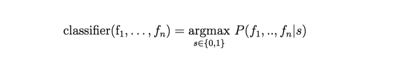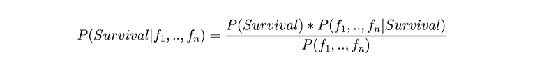 朴素贝叶斯分类器本质上是寻找能描述给定特征条件下属于某个类别的概率的函数,这个函数写作 P(Survival | f1,…, fn)。我们使用贝叶斯定理来简化计算: