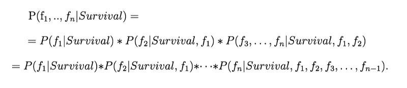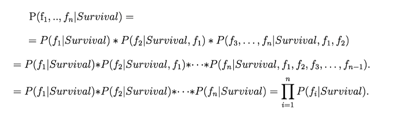 上式最后一行的每一项的计算都需要一个包含所有条件的数据集。为了计算 {Survival, f_1, …, f_n-1} 条件下 fn 的概率(即 P(fn | Survival, f_1, …, f_n-1)),我们需要有足够多不同的满足条件 {Survival, f_1, …, f_n-1} 的 fn 值。这会需要大量的数据,并导致维度灾难。这时朴素假设(Naive Assumption)的好处就凸显出来了。假设特征是独立的,我们可以认为条件 {Survival, f_1, …, f_n-1} 的概率等于 {Survival} 的概率,以此来简化计算:
