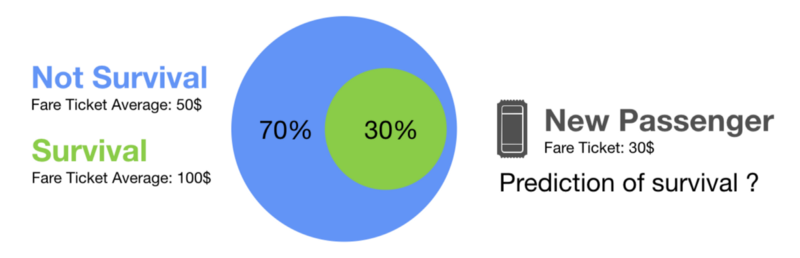 假设你随机取了 500 名乘客。在这些样本中,30% 的人幸存下来。幸存乘客的平均票价为 100 美元,而遇难乘客的平均票价为 50 美元。现在,假设你有了一个新的乘客。你不知道他是否幸存,但你知道他买了一张 30 美元的票穿越大西洋。请你预测一下这个乘客是否幸存。