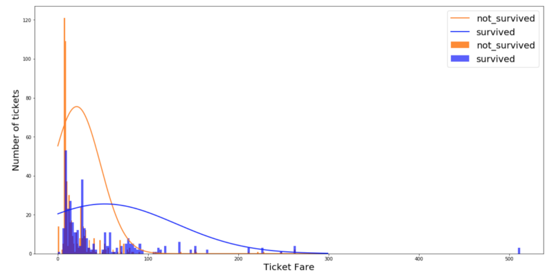然后,根据式 3,我们只需要得出概率分布函数 P(fare| Survival = 0) 和 P(fare| Survival = 1)。我们选用高斯朴素贝叶斯分类器,因此,必须假设数据按高斯分布。