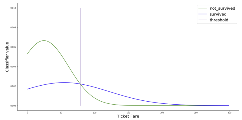 好吧,你可能回答说这个乘客没能幸存。为什么?因为根据上文所取的乘客的随机子集中所包含的信息,本来的生还几率就很低(30%),而穷人的生还几率则更低。你会把这个乘客放在最可能的组别(低票价组)。这就是朴素贝叶斯分类器所要实现的。