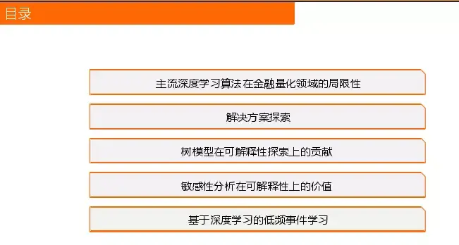 今天分享的内容主要从以上五个方面介绍,首先讲一下主流深度学习算法在金融领域的局限性,然后针对这些局限性所做的探索解决方案,以及在探索过程中主要围绕可解释性和低频学习这两点的展开讲解。
