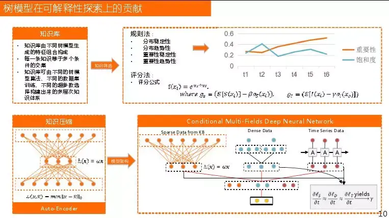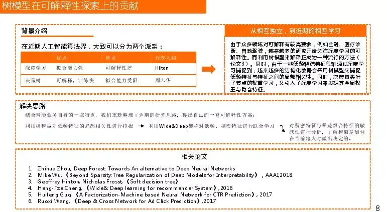 首先介绍树模型为什么在可解释性方面做了很多贡献,之所以不说作用因为它不是直接在这个体系起到可解释性的作用,但是它可以做一些解释。目前算法主要分为深度学习和非深度学习,主要围绕决策树。深度学习拟合能力非常强,但是解释能力较差;决策树可解释、训练快,但是拟合能力受限。之前两个流派很对立,后来两者去相互学习,利用各自的优点。如在解释方面Jefreeheten提出asab Tree算法,大致学习深度学习在图像学习如何做预测和分析,做树模型也在拟合能力方面做出相应的探索。还有阿里巴巴、以及其旗下的卖金服在树模型探索和与Deep learning结合方面也做了很多工作。结合我们自身,我们的解决思路是利用树模型很好地可解释性对局部的探索能力去挖掘特征,将价值发挥到最大,深度学习去探索局部特征还是有一些问题,主要是低频特征影响。利用混合架构wide&deep或者其他对稀疏化或者稠密的数据进行学习,最后利用敏感性分析对其进行解释,对预测值归类的依据是什么。为什么不直接利用深度学习对其敏感性进行分析呢,敏感性分析有一个问题就是重要性差异不大,敏感性不强。而且在金融领域有个特点就是没有先验特征,很难有明显特征区分类别,这也是树模型所起的作用。