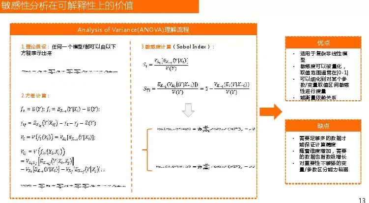 方差分析理论基础是任何一个模型都由一些常量关系加一些单变量输出以及变量两两输出等,比如输入一个X,输出一个Y,fn是差值,如果扰动xi, fi是如何变化的。如果把所有的方差放在一起,改变一些参数,输出扰动变化程度是多少,这就是方差分析的工作。方差分析由于输入的参数不同,最后会有很大差异,因此利用Sobol Index技术将其归一化,就是用求出的方差与自身方差做比值。方差分析的优点:适用于复杂非线性模型,敏感度可以被量化,取值范围通常在[0-1],可以细化到对某个参数/变量取值区间敏感性进行度量,能衡量依赖关系;缺点是:需要足够多的数据才能保证计算精度,随着维度增加,需要的数据也指数级增长,对重要性不够强的变量/参数区分能力较弱。