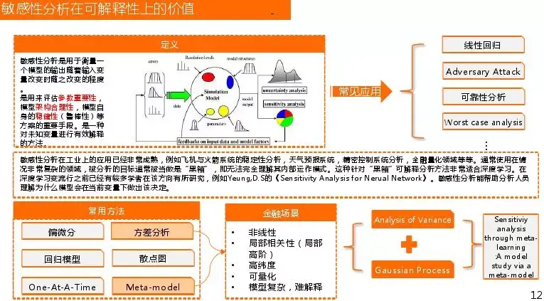 Worst case analysis、可靠性分析这两个分析更偏工业性些,在金融领域比较罕见。敏感性分析在工业领域尤其是量化领域应用较多,引入敏感性分析目的就是解释黑箱的DN。DNN也是一个黑箱问题,知道大概机理,但内部如何运作原理不清楚。其实在这块早就有研究,真正火起来是在15年,《Sensitivity Analysis for Nerual Network》的作者在10年就提出来,讲述了如何利用敏感性分析去阐释神经网络。敏感性分析目的是将变量的敏感度量化起来,规划为线性回归的模式,提供重要性指标,利用线性加权。常用的方法有偏微分、回归模型、One-At-A-Time、方差分析、散点图、Meta-model,前面三个为一阶分析,变量对其自身变化敏感性分析,这样应用的假设是变量之间基本没关系。在金融领域变量间基本都有关系,会用到方差分析和Meta-model,散点图是为了直观分析。这是为了适应应用场景非线性、局部相关性(局部高阶)、高纬度、可量化、模型复杂、难解释,今天主要是将Analysis of Variance和Gaussian Process,这两块可以独立模块,后续会将其联合讲解。