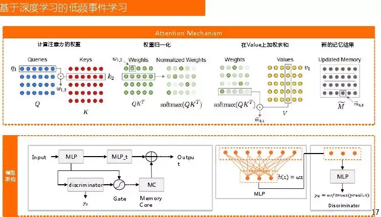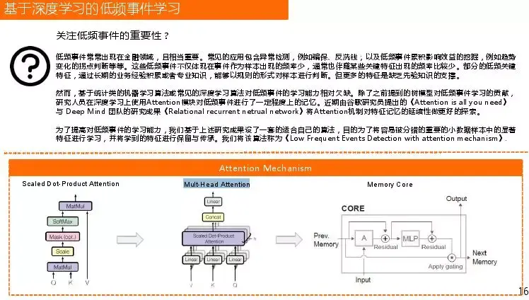 低频事件在金融领域太过常见,在做量化股指期,需要对拐点期进行预测判断,拐点出现的次数非常少,特征也很模糊。在反洗钱领域,拐点出现也很稀少,但是有些特征会很明显,如果直接拿模型去学习是无法得到结果的。我们之前一直尝试用attention做低频事件学习,但是有一个难点低频事件很难出现,而且很多是基于先验知识,在金融领域先验知识又很少。近期由谷歌研究员提出的《Attention is all you need》与 Deep Mind 团队的研究成果《Relational recurrent netrual network》将Attention机制对特征记忆的延续性做更好的探索。这两篇文章主要解释的是时序相关,但是我们领域不需要关注时序相关,只对某一些我总分错有很重要的数据样本感兴趣。为了提高对低频事件的学习能力,我们基于上述研究成果设了一套的适合自己的算法,目的为了将容易被分错的重要的小数据样本中的显著特征进行学习,并将学到的特征进行保留与传承。我们将该算法称为《Low Frequent Events Detection with attention mechanism》。Scaled Dot-Product Attention很早就开始用了,就是给你一个请求,对应会有一些key,观察每一个query对key的响应程度是多少,将这种影响随value传递下去,最后改变value实际输出值。Mult-Head Attention是多个组合,做了一些线性变化,目的使特征更加丰富。
