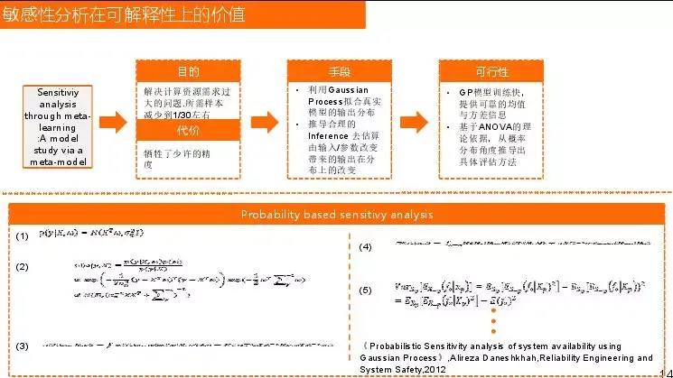针对方差分析的缺点如何解决呢,尝试用一个模型去描述模型的分布情况,用一个模型去监测变化的状态,利用一个模型学习模型进行替代。这样的模型有很多,我们选择是Gaussian Process,它输出的是你输入一个变量所产生的期望的均值以及方差,这也是敏感性分析所需要的信息。不用朴素贝叶斯或者其他原因是我们的对象是复杂的非线性模型,朴素贝叶斯拟合能力有限,Gaussian Process需要设置很多的操作树和function,这些function是为了拟合变量的均值和不同情况出现的方差,能够很好地拟合现实中的分布。其原理是基于朴素贝叶斯,将变量进行了更复杂的空间映射,找出后验的权重分布,用Inference 去估算由输入/参数改变带来的输出在分布上的改变,其具体原理和思路可以参考论文《Probabilistic Sensitivity analysis of system availability using Gaussian Process》。敏感性分析核心就是输入的变化对输出有怎样的改变,可以用很多方法得出近似的重要性。深度学习如果从机理上证明是很困难的,大都是在选取适合自己业务情况下用不同的方法去阐释。