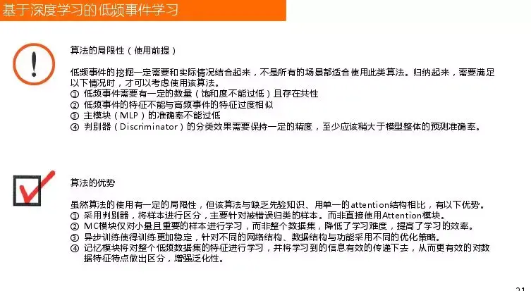 最后总结一下算法局限性:低频事件的挖掘一定需要和实际情况结合起来,不是所有的场景都适合使用此类算法。归纳起来,需要满足以下情况时,才可以考虑使用该算法。① 低频事件需要有一定的数量(饱和度不能过低)且存在共性② 低频事件的特征不能与高频事件的特征过度相似③ 主模块(MLP)的准确率不能过低④ 判别器(Discriminator)的分类效果需要保持一定的精度,至少应该稍大于模型整体的预测准确率。但是算法也有很多优势, 与单一的attention结构相比,有以下优势。① 采用判别器,将样本进行区分,主要针对被错误归类的样本。而非直接使用Attention模块。② MC模块仅对小量且重要的样本进行学习,而非整个数据集,降低了学习难度,提高了学习的效率。③ 异步训练使得训练更加稳定,针对不同的网络结构、数据结构与功能采用不同的优化策略。④ 记忆模块将对整个低频数据集的特征进行学习,并将学习到的信息有效的传递下去,从而更有效的对数据特征特点做出区分,增强泛化性。
