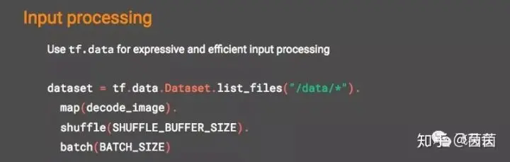 你现在在数据管道方面还在用numpy吗?假如你想用TensorFlow的话,目前tf.data namespace可以使你在TensorFlow的输入处理上更具表现力。tf.data可以为您提供快速、灵活、易于使用的数据管道,同时还提供同步的训练。