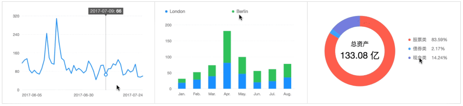 常见图表:从左到右分别为折线图、柱状图和饼图