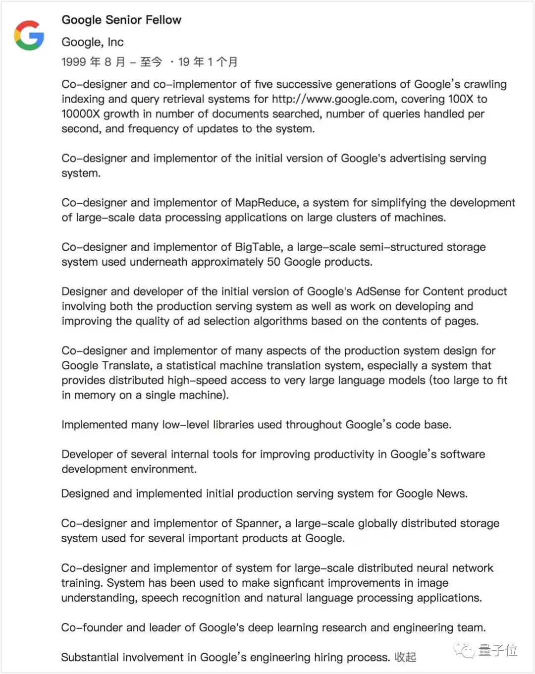 1999年加入初创期的Google,设计并部署了Google广告、抓取、索引和查询服务系统的大部分内容,以及位于Google大部分产品下方的各种分布式计算基础架构,也是Google新闻、Google翻译等产品的开发者。