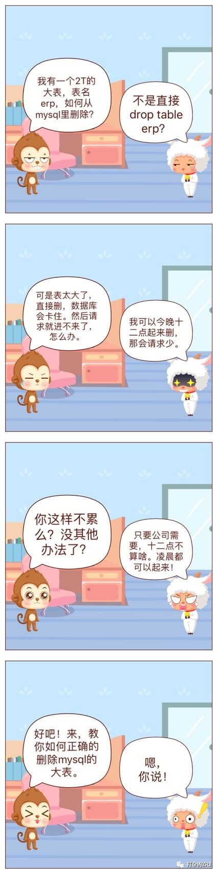 这意味着,如果在白天,访问量非常大的时候,如果你在不做任何处理措施的情况下,执行了删大表的命令,整个mysql就挂在那了,在删表期间,QPS会严重下滑,然后产品经理就来找你喝茶了。所以才有了漫画中的一幕,你可以在晚上十二点,夜深人静的时候再删。
