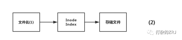 这个时候,你做了删除文件名(1)的操作,linux系统检测到,还有一个文件名(2)指向Inode Index,因此并不会真正的把文件删了,而是把文件名(1)的引用给删了,这步操作非常快,毕竟只是删除引用。于是图就变成了这样