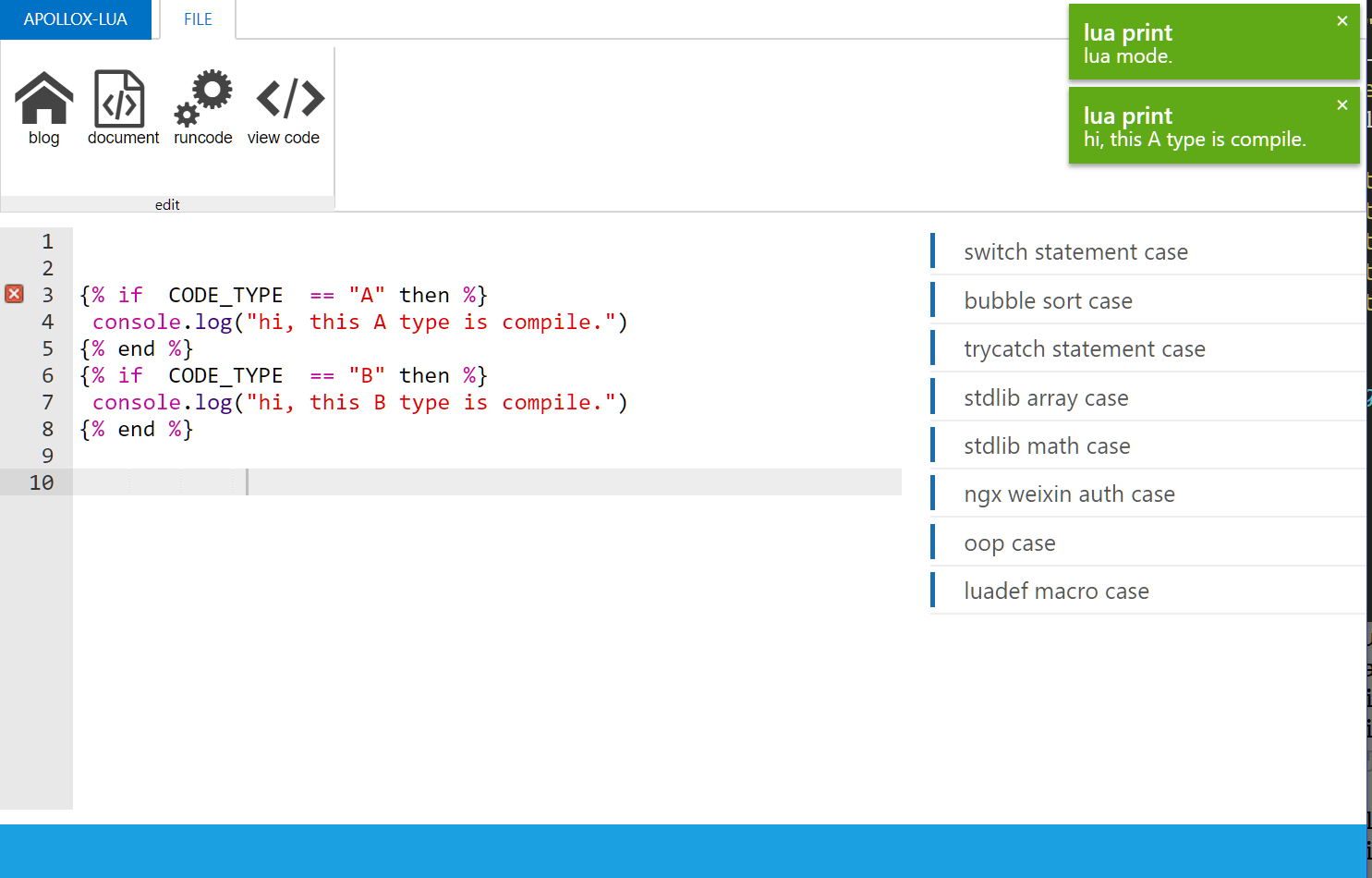 本文讲解如何在两种模式下使用macros,首先在apolloxlua下有两种模式, 一种是 web模式另一种是工具模式。 web模式下我们可以在浏览器端来使用,但是有一些限制, 就是比如说某些native的api是无法使用的, 比如说ngx,redis,mysql这种。示例请看 web控制台示例 。而另外一种工具模式, 工具模式没有使用限制。