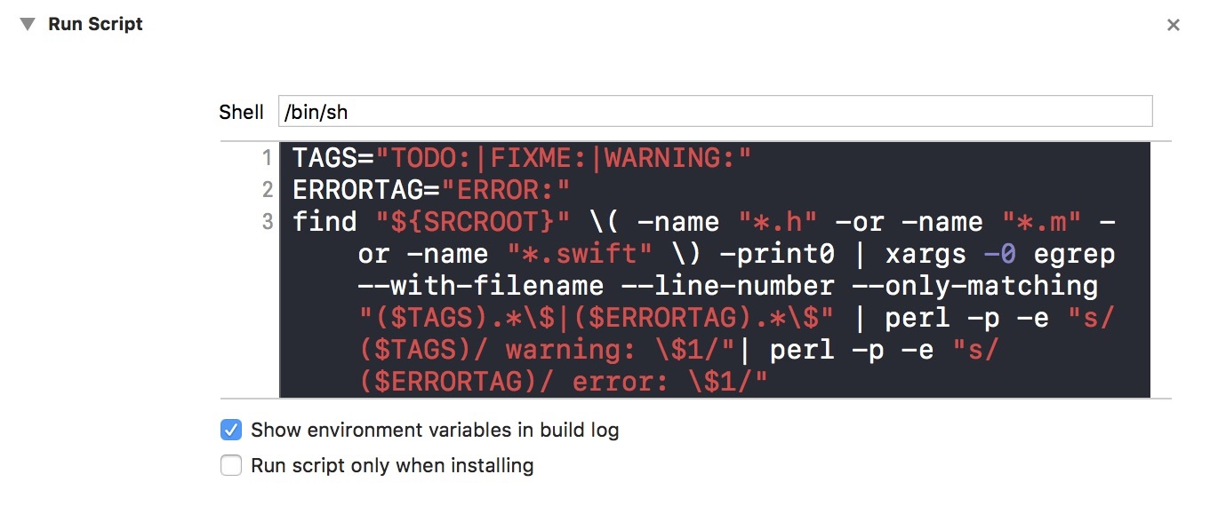 find "${SRCROOT}" \( -name "*.h" -or -name "*.m" -or -name "*.swift" \) -print0 | xargs -0 egrep --with-filename --line-number --only-matching "($TAGS).*\$|($ERRORTAG).*\$" | perl -p -e "s/($TAGS)/ warning: \$1/"| perl -p -e "s/($ERRORTAG)/ error: \$1/"