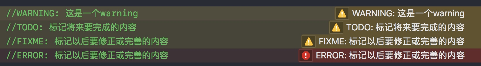 设置完 shell 脚本后,编译代码,WARNING、TODO、FIXME 就会出现相应的⚠️,而 ERROR 就会被当错编译❌来处理。