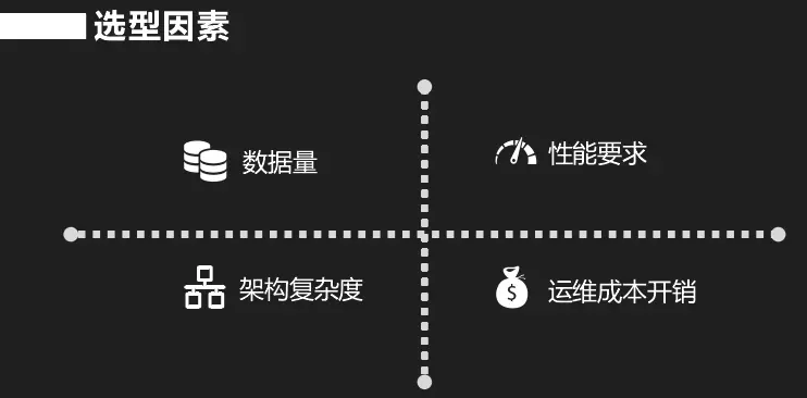 重点讲解第三点,首先是数据量,依据系统数据量容量,平台至少要达到我的最低性能指标。还有一个就是架构复杂度,一个系统最终要上线,要保证CLA,如果架构复杂,出问题就多;因此选择架构相对简单一点的。最后一个就是运维和开销,运维的成本很高,因此不可能去经常做改动;如果要改一个东西你需要熟悉一下这个平台,那么就会影响你的选型了。