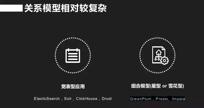 对于BE系统很多实用宽表做,因为其维度很多,一个用户经过慢慢信息积累可能会有几百个维度,假如对一个50个维度进行过滤,利用宽表结合一些特殊数据结构如倒排就会很容易实现。Elastic Search, Solr是搜索引擎,Click House是俄罗斯开发的一个性能比较好的系统,但是join支持有限, Druid在广告平台用的比较多。还有一种是组合模型,如Elastic Search, Solr用的比较多,典型的有Green Plum,Presto,Impala。