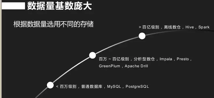 交互查询特点第一个就是数据量庞大,第二个关系模式相对比较复杂,依据你的设计不同,关系模式有很多种类。还有一个就是响应时间要求较高,对于对于绝大数要求查询返回时间在10秒以下;依据数据量的不同选择不同的存储,对于百万级数据采用MySQL,PostgreSQL,对于百万-百亿级别,传统数据库无法满足,采用分析性数据仓库实现Impala,Presto, Green Plum, Apache Drill;百亿级别以上很难做大数据分析,采用离线数据仓库,采用hive,spark。
