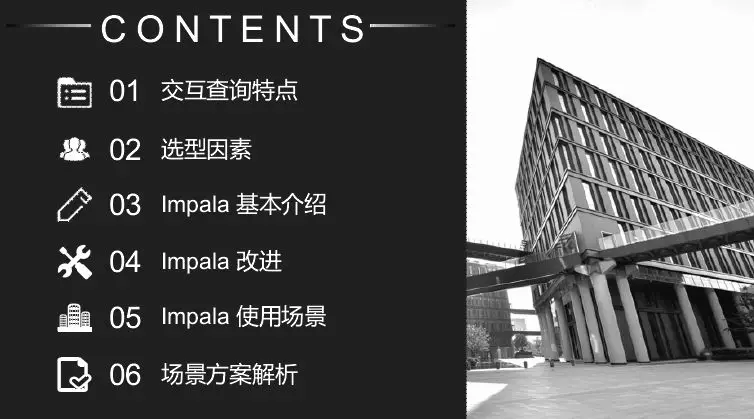 下面是今天分享的内容大纲,第一个讲一下交互式查询的特点,在大数据平台有很多查询平台可以选择,第二个讲一下依据项目如何选择平台,选型因素是什么。第三个讲一下Impala基本介绍,以及在Impala上的改进。接下来是impala的应用场景,最后介绍下Impala底层数据流,应用场景解析以及存在的一些问题。