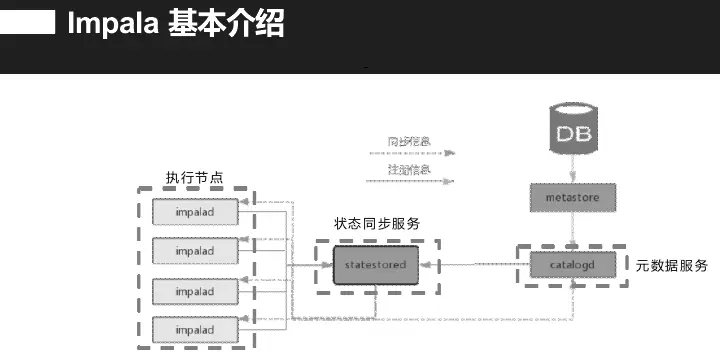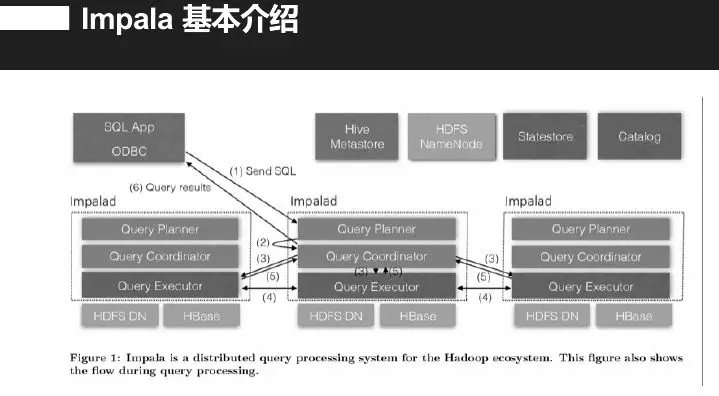 接下来讲一下Impala架构,其兼容多种数据源就是metastore直接对接各种DB,利用catalogd提供元数据服务。可以直接连DB也可以通过catalogd,一般是利用hive里的metastore获取数据。Impala高效的原因是其将原始数据缓存下来,catalogd启动会浏览缓存获取数据。它有一个statestored服务,是一个发布订阅服务,所有状态以及轮转都是在statestored服务中进行。左边是impala的执行节点,所有查询都是发完这些节点,节点执行后会下发到所有相关节点上去,整个impala是无状态的,所有的连接者都像是一个协调者。
