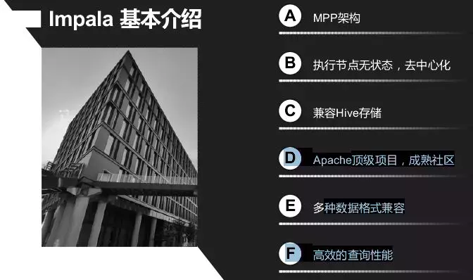 这三个都是MPP架构,Impala整个执行节点都是无状态的,因此down掉一个节点,再启动没有问题。Impala兼容hive存储,还有一些点如Apache顶级项目、成熟社区、多种数据源格式兼容、高效的查询性能都是我们考虑特有的选型因素。