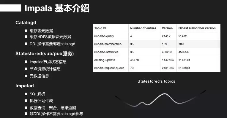 Catalogd是元数据服务,其主要的问题是你做select时,impala也会缓存一部分数据,它不会进入catalogd服务,但是做DDL操作会应用catalogd服务。Statestored(sub/pub )有很多topic,所有的impala节点去订阅这些topic上的相关消息,Statestored实际是在很多topic上做了一个消息订阅。Impala节点有SQL解析、执行计划生成,还有是数据查询、聚合、结果返回。