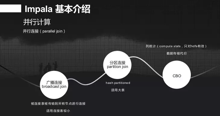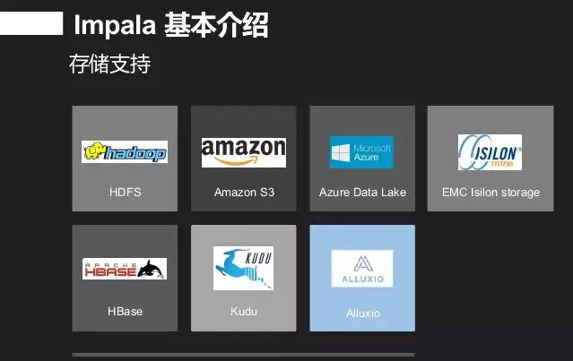 接下来介绍下impala支持哪些存储引擎,常用的有hdfs,还有kudu,为了解决HDFS和HBASE进行交互而产生的一个产品。Hbase主要是一个kb查询,但是如果有大量扫描时性能很差,而大批量扫描是HDFS的强项,但是做不了kb查询。Alluxio是一个文件记录换缓存,底层也可以对接HDFS,支持多级缓存。我们做Alluxio主要是应对热力数据,以前使用缓存解决这个问题。