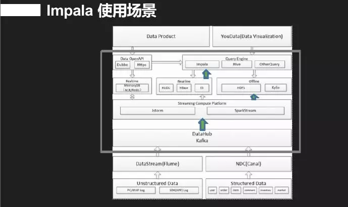 Impala应用场景介绍,上图是一个部门大数据平台架构,从kafka数据到HDFS,结构化到半结构化这是数据的接入。经过数据清洗,再接入到上层,上层应用了ES存储,最上面就直接用impala来进行查询,这基本就是分析系统的框架。