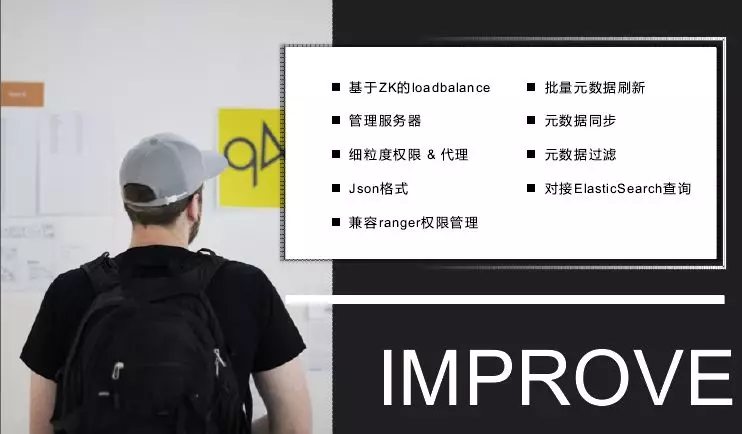 有缺陷就有改进,首先基于ZK的load balance,因为impala是和hive绑在一起,hive的server是基于ZK,将你需要访问的impala的uri写入一个维度中去,hive原生就是基于ZK的多维节点访问。第二个就是管理服务器,因为impala页面的信息不会保存,利用管理服务器保存这些东西,排查时在管理服务器上查,不会因为你impala节点多而信息不保存。细粒度权限&代理,通过impala访问HDFS实现底层权限控制。Json格式,这个就是偏应用需求。兼容ranger权限管理,因为我们整个项目权限管理是基于ranger的。批量元数据刷新,也是实际应用中出现的问题,有时会一次改好几十个表,如果每次都刷新会很麻烦。元数据同步,改造hive和impala,每次hive改变,将改变写入中间层,impala去获取中间层实现同步。元数据过滤,数据量很庞大时,其实交互式查询很大一部分表是用不到的,而impala只对某一部分有需求,因此通过正则表达式过滤掉不必要的数据。对接ElasticSearch查询,将ES涉及的算子下推过去,如多维过滤查询,根据倒排属性比hash将数据聚合要快。