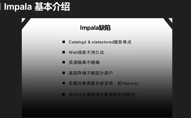讲了impala的优点、特点、如何用,但是基于开源平台,也是有很多缺陷。第一个Catalogd&statestored服务单点,但是好在对查询不受影响,如果Catalogd挂掉,元数据更新就不会同步到整个impala节点。Statestored挂掉,对于更新也不会同步,只会保挂掉之前的信息。第二个就是web信息不持久,显示的信息都是存在历史信息中,如果impala重启后信息就会没有了。资源隔离不精准,还有就是底层存储不能区分用户,还有就是负载均衡,每一个impala都可以对接SQL,但是有100个impala如何接入不好解决,因此对impala实现haproxy。还有与hive元数据同步需要手动操作,impala是缓存元数据,通过HDFS操作是不会感知这种操作的。
