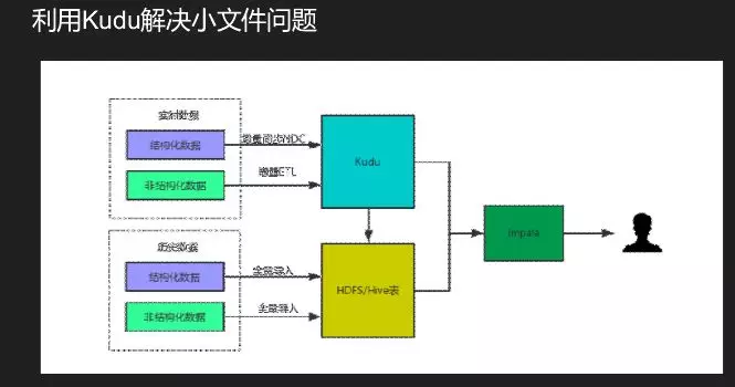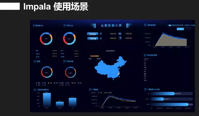 上面是我们的一个BI产品,叫有数。底层也对接了impala平台,这是一个数据分析报表平台,将图表与地图上的数据进行对接。将结构化数据或非结构化数据直接写入hive,然后通过impala去感知,实现元数据同步,用户直接通过impala去查询。需要考虑问题有元数据同步问题,ETL写入数据impala无感知,依赖元数据同步;数据实时性问题,避免大量小文件导致NN不稳定,每次写文件的batch不能太小。还有一个方案是利用kudu解决小文件问题,将实时数据往kudu里写,将kudu和hdfs实现联查,在impala上既能看到kudu的表也能看到hdfs的表。