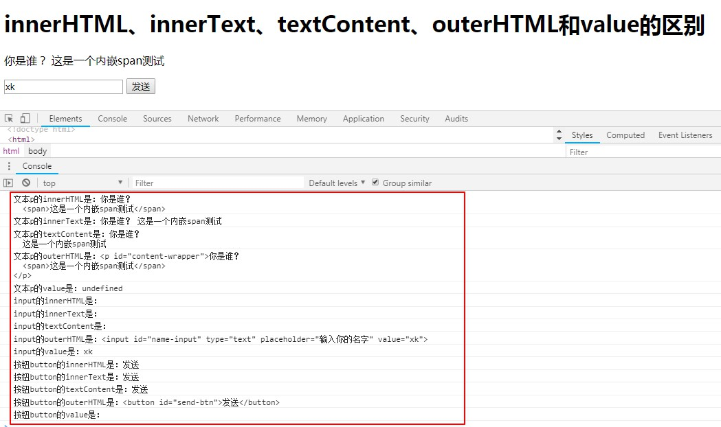 - 这个是最好区分的,直接看例子,它会把DOM元素本身的标签+内容+格式全部显示出来。